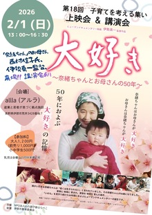 山の遊び舎はらぺこ主催 第18回「子育てを考える集い」(映画『大好き〜奈緒ちゃんとお母さんの50年〜』上映会&講演会)を開催します。